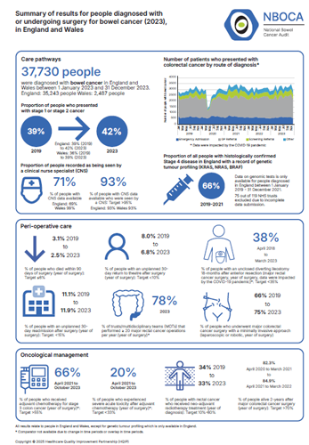 We are pleased to announce the publication of the National Bowel Cancer Audit (NBOCA) State of the Nation Report 2025 for England and Wales. The report, alongside an interactive data dashboard presenting provider-level results, is available to view here: NBOCA State of the Nation Report 2025 - National Cancer Audit Collaborating Centre.