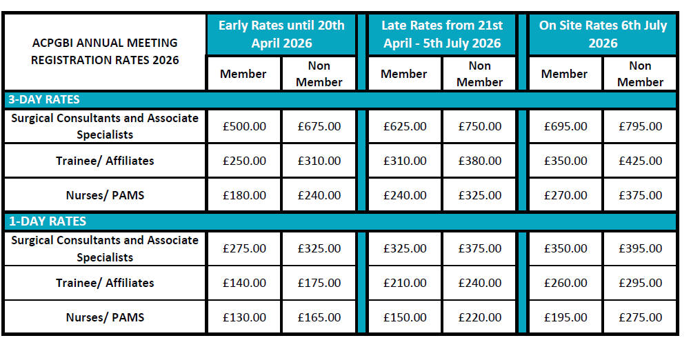 Registration is live & now OPEN We are delighted to invite you to ACPGBI's 2026 Annual Meeting REGISTER HERE For member coupon codes please email ntaub@acpgbi.org.uk Event Organisers ACPGBIevents@execbs.com Tel 01543 442140 https://execbs.com/