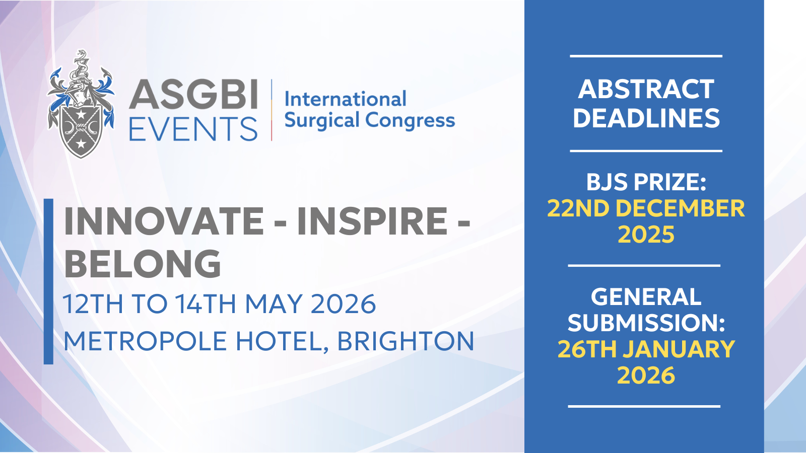 ASGBI international Surgical Congress 2026 ACPGBI Events menu ACPGBI 2026 Annual MeetingACPGBI 2026 Annual Meeting - Call for absractsCourses, Events and WebinarsForthcoming EventsCourse Accreditation and CPD ApprovalSubmit an EventCode of Conduct 12 May 3:48PM – 14 May 3:48PM 2026 Brighton Metropole Book online for this event Download Event to Calendar Event Further details about this event Book online for this event Organised by: ASGBI ← Other events